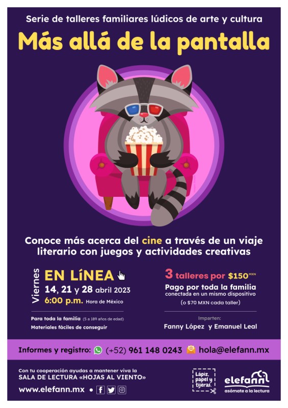 - Cooperación por familia*: Los 3 talleres por $150 MXN (Ciento cincuenta pesos 00/100 MXN) o cada taller por $70 MXN.