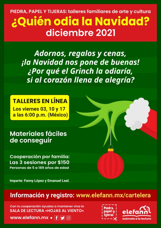 ELEFANN te invita a disfrutar de “PIEDRA, PAPEL Y TIJERAS”, talleres familiares de arte y cultura que tienen por objetivo la reflexión de diversos temas a través de actividades lúdicas, fomentando la convivencia intergeneracional y el despertar de la curiosidad para conocer más el mundo. Es por eso que, a diferencia de otros talleres, estos buscan la participación activa de la niñez, la juventud y la adultez.